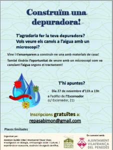 L’Abraham Guillén i la Montserrat Traver amb la col·laboració de l’Ajuntament de Vilafranca del Penedès han organitzat una activitat divulgativa per explicar el funcionament d’una depuradora. D’una banda, es realitzarà la construcció d’un model amb materials aprofitats i s’observaran els diversos tipus de tractaments a què se sotmet l’aigua residual. Paral·lelament, observaran a través del microscopi els microorganismes que hi ha en l’aigua sense cap tractament, i ho compararan amb l’aigua ja tractada.