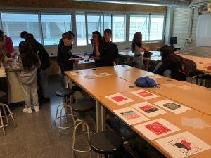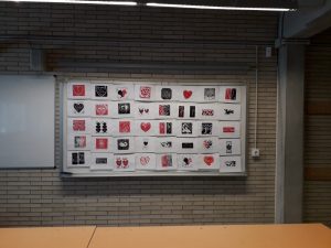 Han realitzat una il·lustració per estampar sobre paper amb la mateixa tècnica del linòleum, però amb un material una mica més dúctil: el blue carving block, una base de goma blava fàcil de treballar. El resultat del taller per a cada participant ha estat l’estampació de dues postals: una per endur-se’n a casa i una altra que ja forma part d’un mural conjunt penjat en els espais comuns de l’institut.