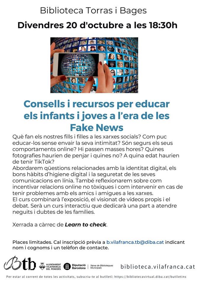 La Biblioteca de Vilafranca ha tornat a programar la xerrada “Consells i recursos per educar els infants i joves a l’era de les Fake News” pel proper divendres 20 d’octubre a les 18:30h.
