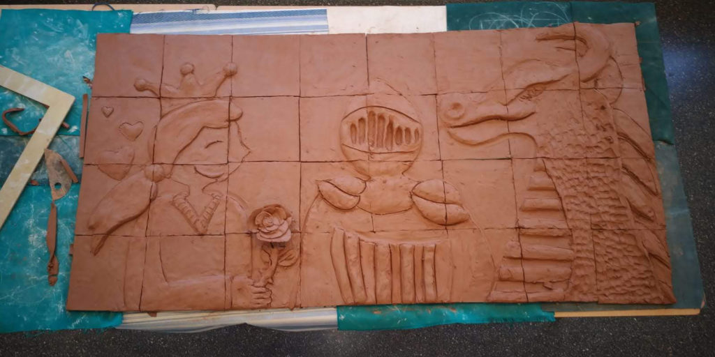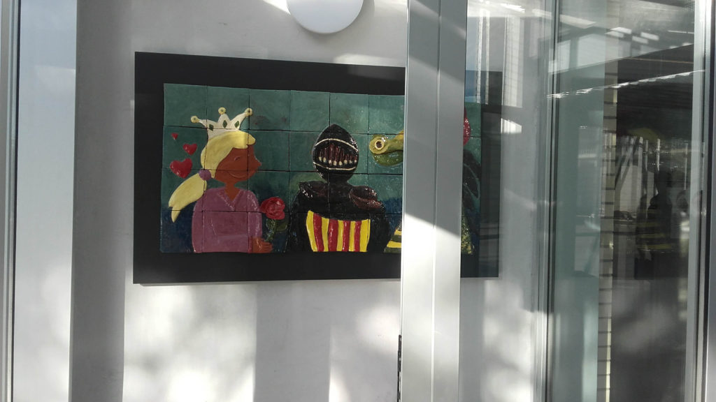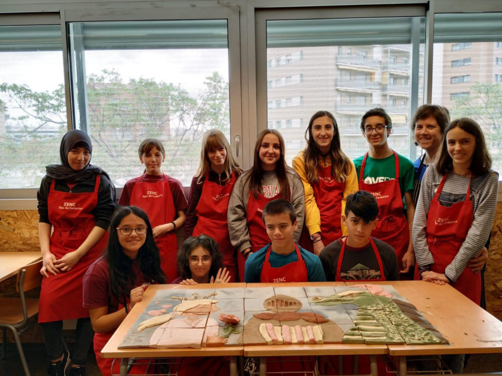 Tots dos tallers han deixat un resultat molt visible: un mural ceràmic sobre Sant Jordi i uns joves estudiants de fusta de gran format.